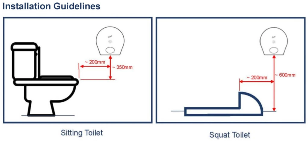 1. กำหนดจุดติดตั้งกล่องเข้ากับผนังห้องน้ำ โดยเว้นระยะห่างจากโถสุขภัณฑ์ (ส้วมชักโครก) โดยประมาณ ~20 เซนติเมตร และสูงจากฝารองนั่ง ~35 เซนติเมตร (กรณีเป็นโถส้วมซึม เว้นระยะห่างจากโดยประมาณ ~20 เซนติเมตร สูงจากพื้น ~60 เซนติเมตร